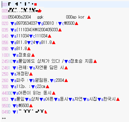 저장한 다음에 열람인계로 넘겨서 정리에서 검색한 다음 마크를 조회해보면 정리가 되지 않은 모습으로 마크 데이터가 나온다.